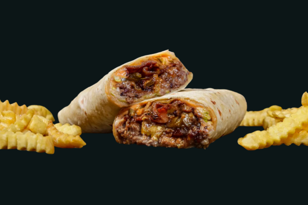 Chicken or Pork, Onion, Flour Tortilla, Bacon & Onion Jam,Β Big Sam's Sauce, Cheese Sauce, Bacon, Mozzarella,Β French Fries