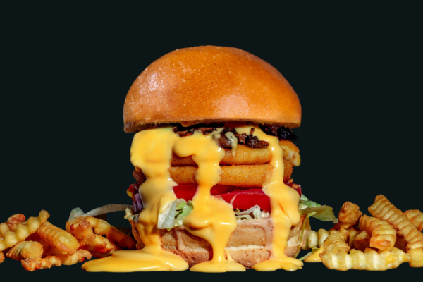 Burger bun, Pieces fried Mozzarella and Chedar,ย Mushroom, Cheese Sauce, Big Samโs Sauce, Iceberg,ย tomato, French Fries.
